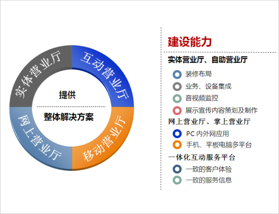 涵蓋引導區、業務代辦區、互聯網服務終端、智能營業終端、自助繳費終端、網上營業廳、手機營業廳、移動智能終端程序、多功能書寫臺等,實現智能營業廳運行的信息化、互動化、智能化。