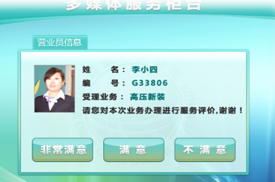 收費區放置平板電腦,提供營業員信息、繳費信息、進行滿意度評價等功能。
